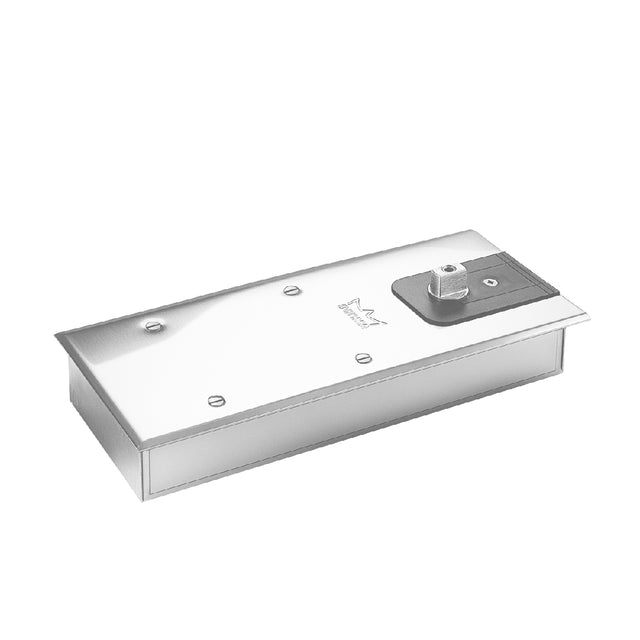 Bisagra hidráulica de doble acción para cristal, metal o madera. Tiene una válvula que programa las velocidades de cierre deseadas desde 130° a 20° y otra válvula que regula el impulso final desde 20° a 0° aprox. Retención de apertura a 90°.