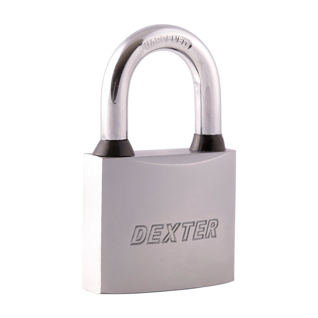 Candado metálico marca Dexter. Este dispositivo es de Alta Seguridad con alta resistencia al corte, dificulta la apertura con ganzúas. Tiene protector contra agua.