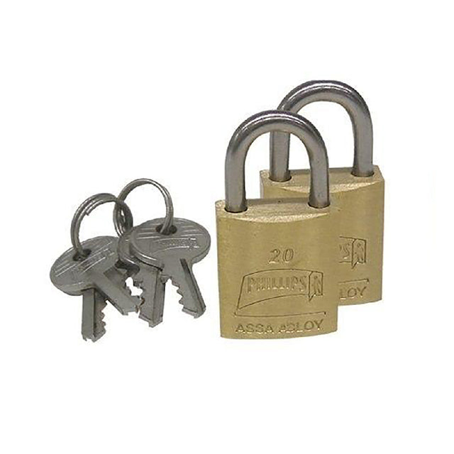 Candado Phillips Modelo 20 Gemelos, fabricado en latón macizo con cilindro y pernos de latón y contra-pernos de carrete. Cuerpo metálico reforzado, satinado o pintado. Doble cerrojo para mayor resistencia al impacto.