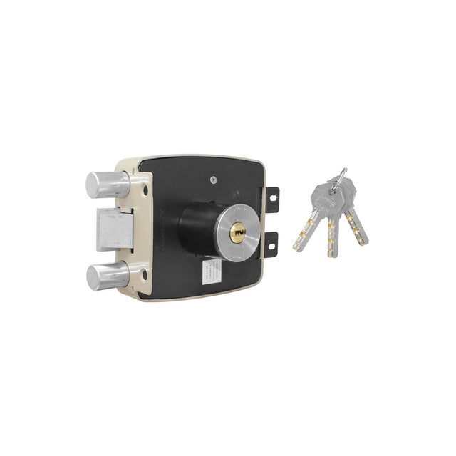 - Cerrojo de dos pasos, con 2 bulones de acero macizo de 18 mm de diámetro, con proyección a 25 mm.