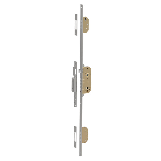 Cerradura de embutir de tres puntos corta con bulones de cierre para puertas de madera.