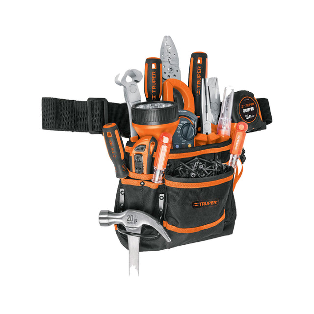 Porta herramientas fabricado en poliéster con forro interno de PVC para larga duración, cinturón ajustable 100% de polipropileno con hebilla de liberación rápida, porta martillo de acero resistente a la corrosión y clip metálico para flexómetro.