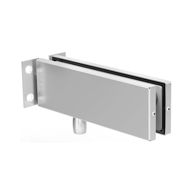 Herraje superior línea Tapalpa con pivote para puerta abatible de vidrio templado, se conecta con herraje 1010. Para instalación en antepecho, incluye placa de fijación lateral a muro para darle soporte.