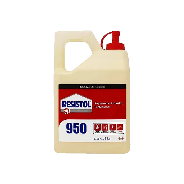 El Resistol 950 es un pegamento color amarillo de alto impacto, diseñado para uso de carpinteros. Su fórmula ofrece mayor resistencia a temperaturas extremas, lacas y barnices.