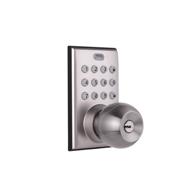 La cerradura digital de alta seguridad de sobreponer Phillips con perilla, cuenta con alarma integrada, indicador de luz, y bloqueo después de tres intentos erróneos; perfecta para instalar en uso en exteriores e interiores.
