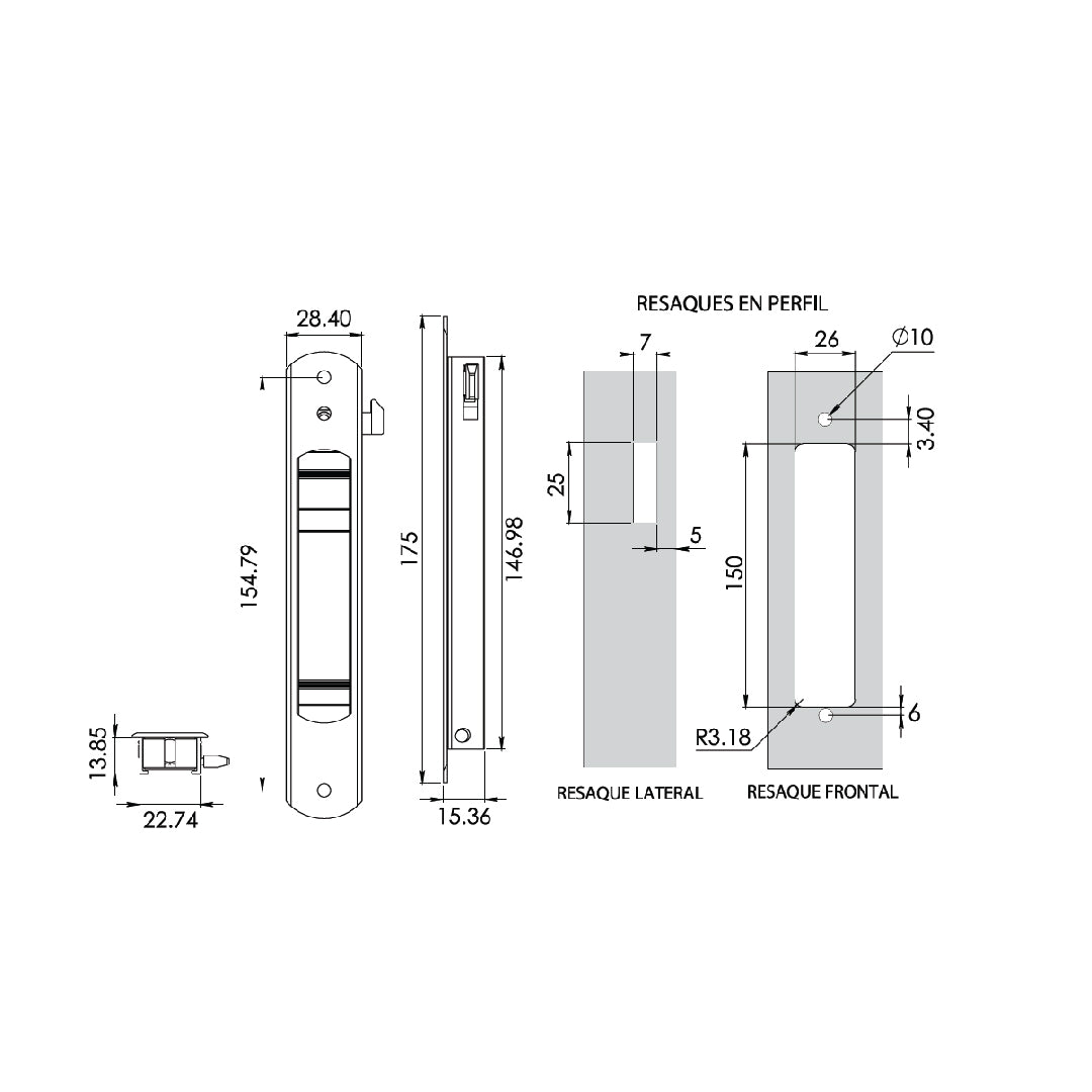 Jaladera de embutir con gatillo y contra, tipo automática, para serie corrediza 70 y 100 de Eurovent Cuprum y línea corrediza tradicional de 3”.
